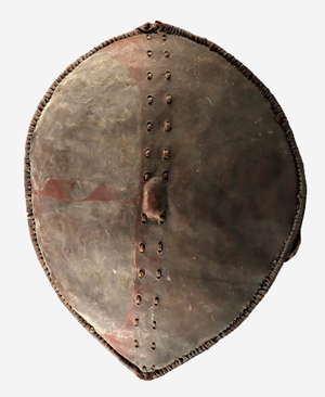 The raised boss on a Maasai shield protects the knuckles from being broken with a knobkerrie strike. A colonial era Maasai shield will weigh almost ten pounds versus a curio version that will weigh about a pound. The added weight is due to a heavy wood frame and much thicker leather.